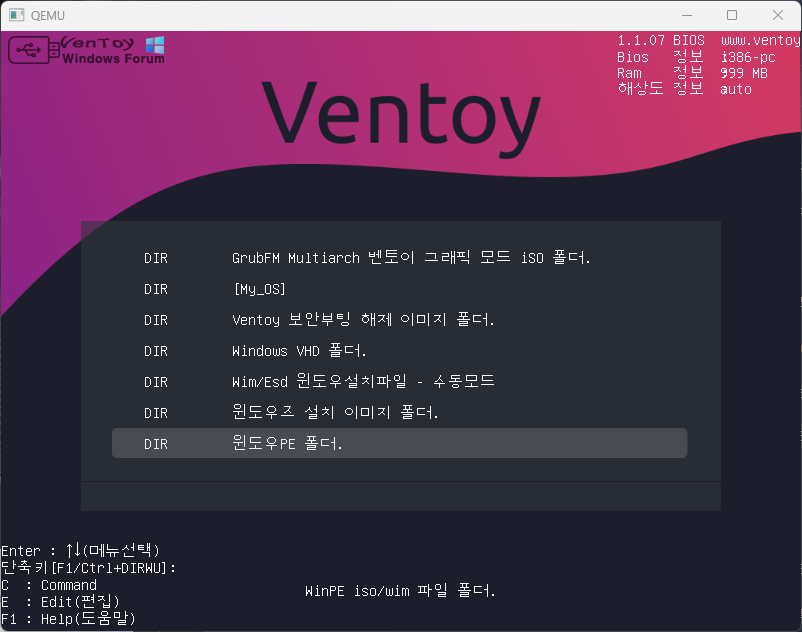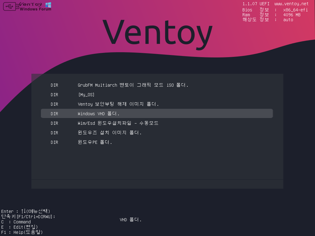 메인화면 해상도 Auto 기능 부여. ( 단.. 이조건은 ventoy.json 설정파일 내부 에 "gfxmode": "auto", 이 옵션도 수정 되어야 함)